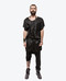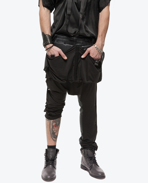 Спереди трикотаж, сзади - костюмная ткань; пояс на резинке; карманы спереди; штанины отделаны декоративными клепками