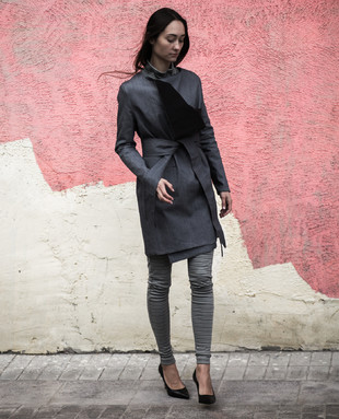 Стильное и удобное платье из фактурного материала, воротник-хомут можно носить по-разному.