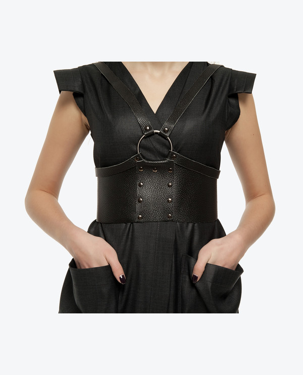 Ремень - сексуальный дизайн с клепками, также возможно исполнение с шипами; регулирующиеся лямки на клепках с металлическими полукольцами на концах; сзади регулируемая застежка; для обуздания самого крутого нрава